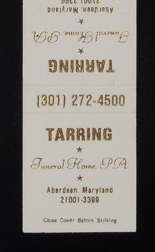 1980s Tarring Funeral Home Aberdeen Md Harford Co Matchbook Maryland Ebay